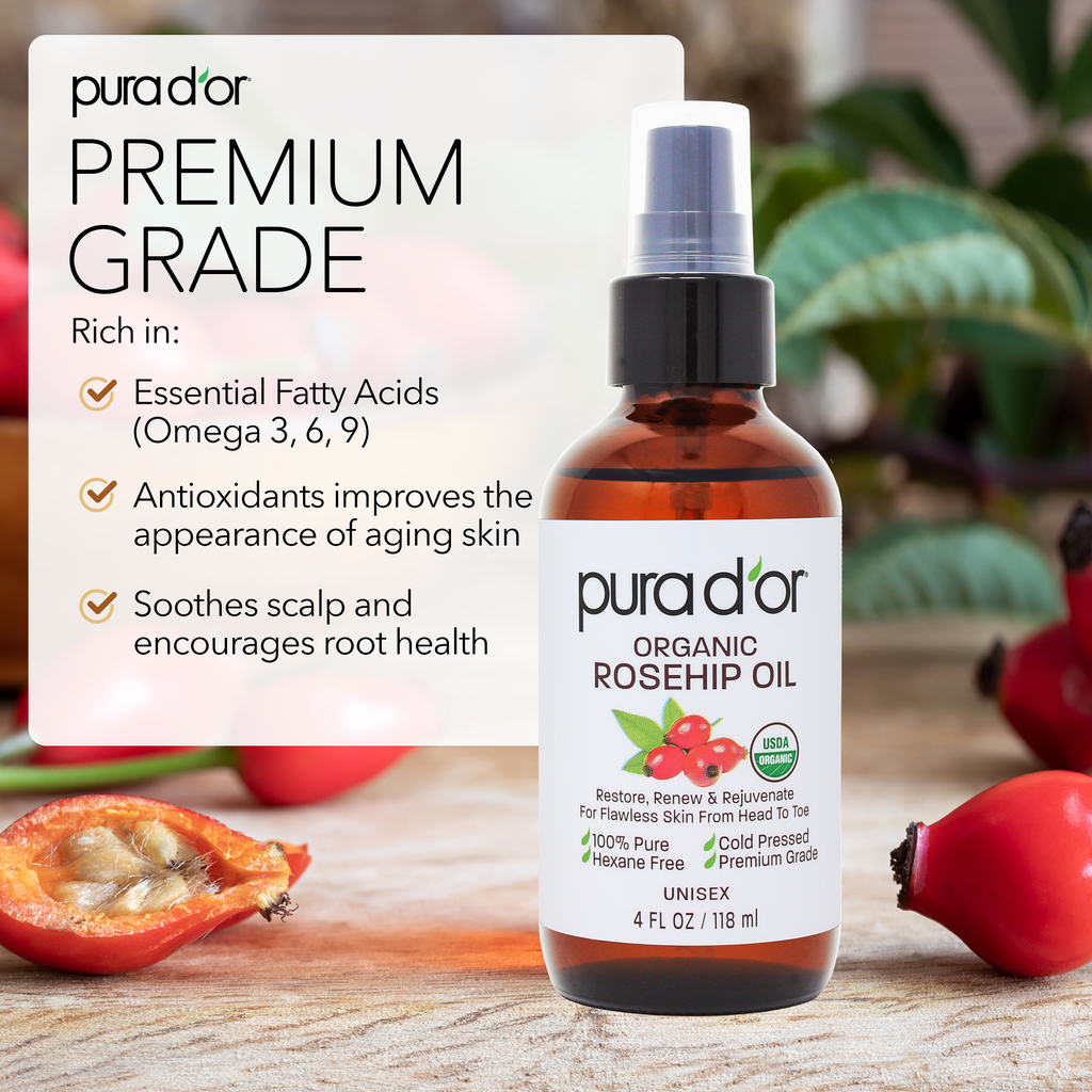 Premium grade cold-pressed rosehip seed oil enriched with essential fatty acids (Omega 3, 6, 9) and natural retinol acid for flawless skin from head to toe