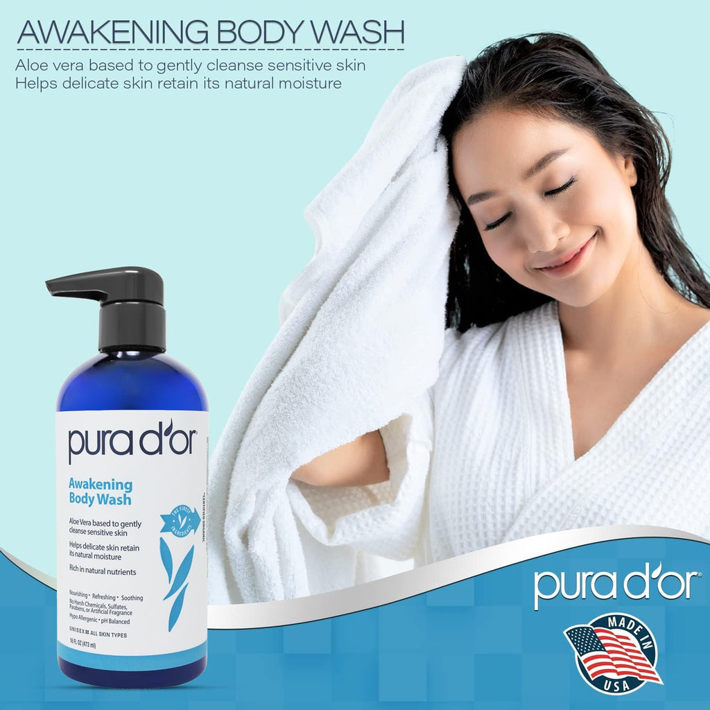 PURA D'OR Awakening Body Wash is made in the USA at an eco-friendly facility. It is infused with a blend of tea tree oil, chamomile oil, and lavender oil. This plant-based Awakening Body Wash will hydrate, cleanse, and freshen your skin. Our gentle ingredients make Awakening Body Wash perfect for all skin types.