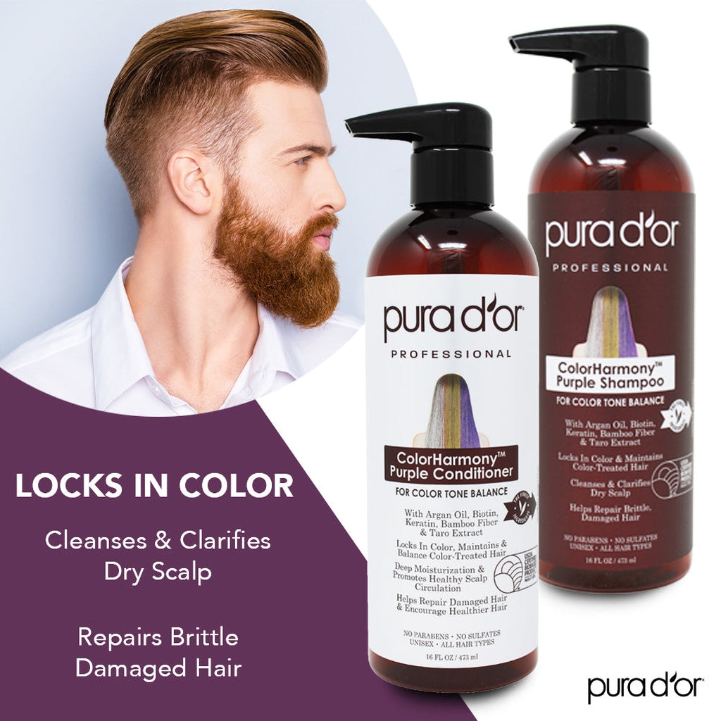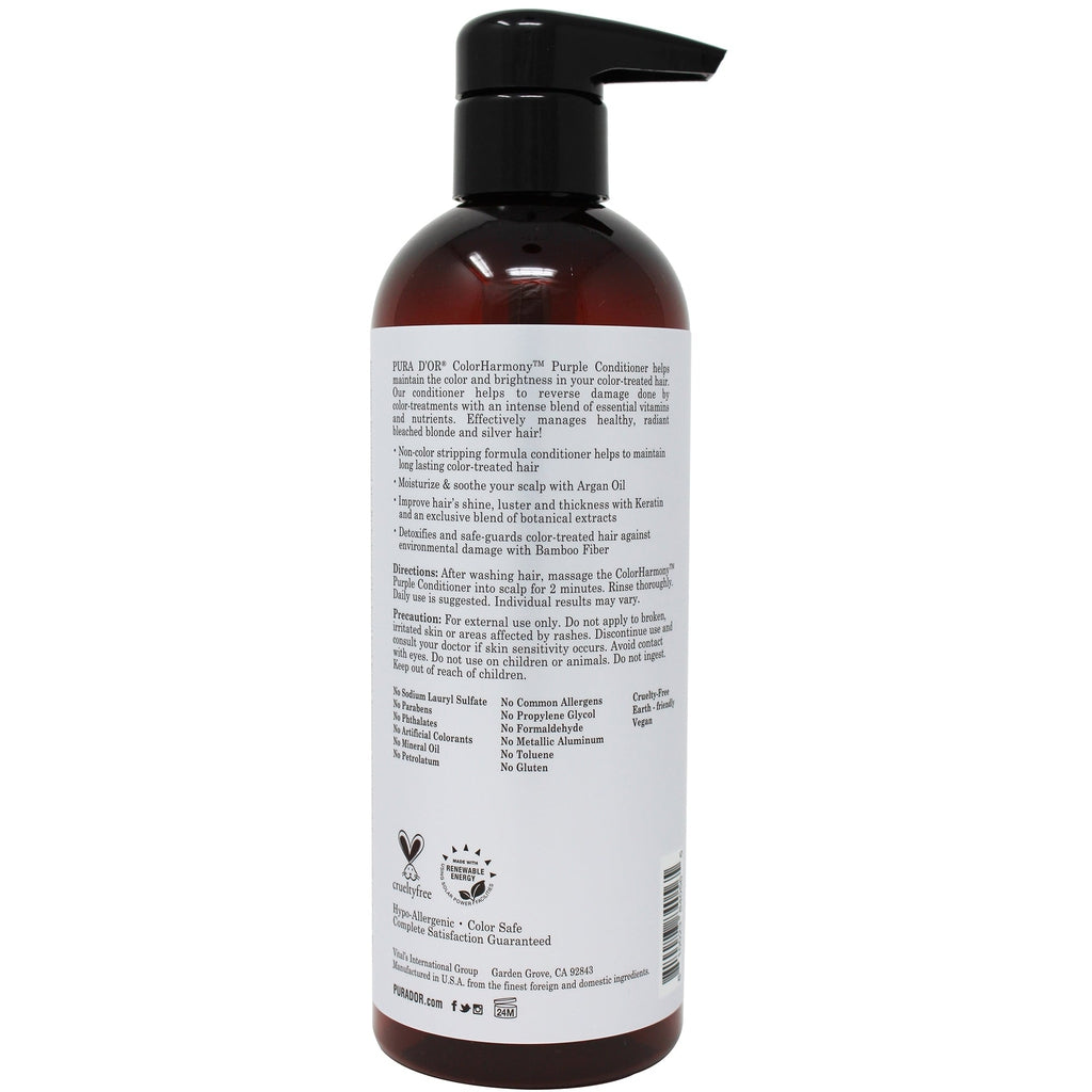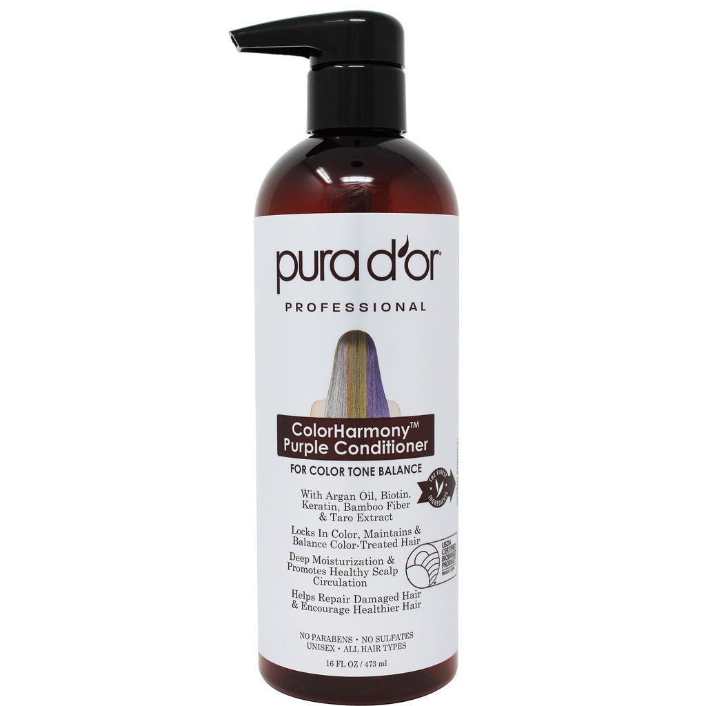 PURA D’OR® ColorHarmonyTM Purple Conditioner helps maintain the color and brightness in your color-treated hair. Our conditioner helps to reverse damage done by color-treatments with an intense blend of essential vitamins and nutrients. Effectively manages healthy, radiant bleached blonde and silver hair!