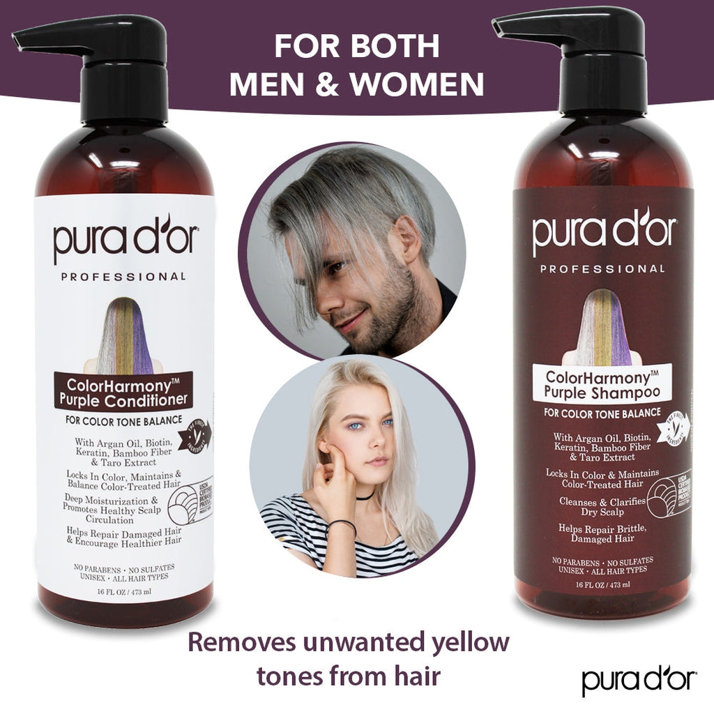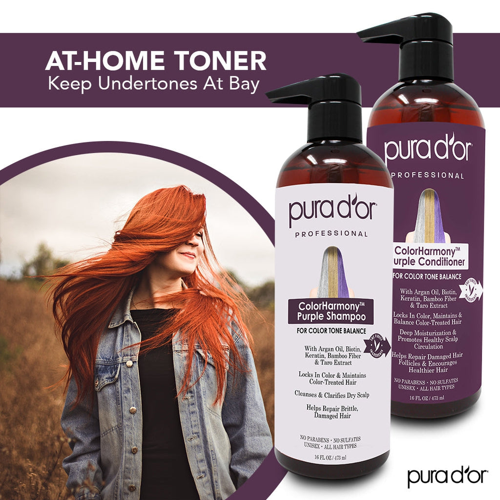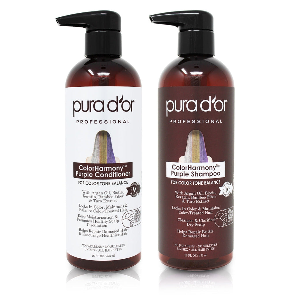 PURA D’OR® ColorHarmonyTM Purple Conditioner helps maintain the color and brightness in your color-treated hair. Our conditioner helps to reverse damage done by color-treatments with an intense blend of essential vitamins and nutrients. Effectively manages healthy, radiant bleached blonde and silver hair!