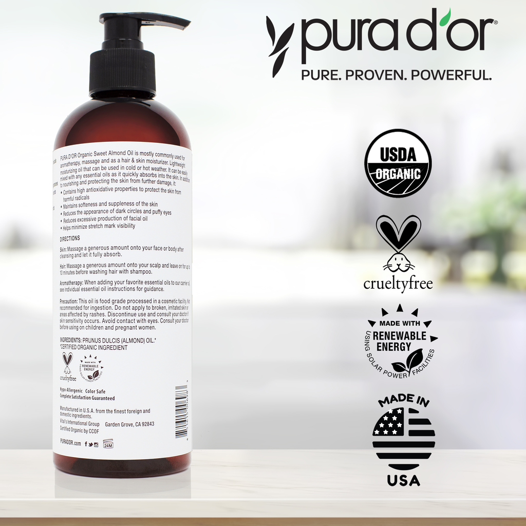 PURA D’OR USDA Certified Organic 100% Pure & Natural Sweet Almond Oil is mostly commonly used for aromatherapy, massage and as a hair & skin moisturizer. Lightweight moisturizing oil that can be used in cold or hot weather. It can be easily mixed with any essential oils as it quickly absorbs into the skin. In addition to nourishing and protecting the skin from further damage.
