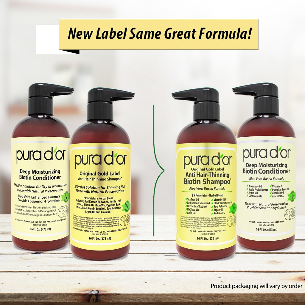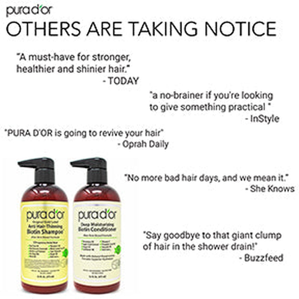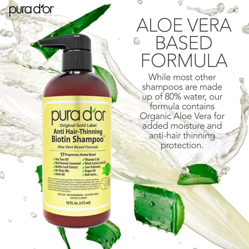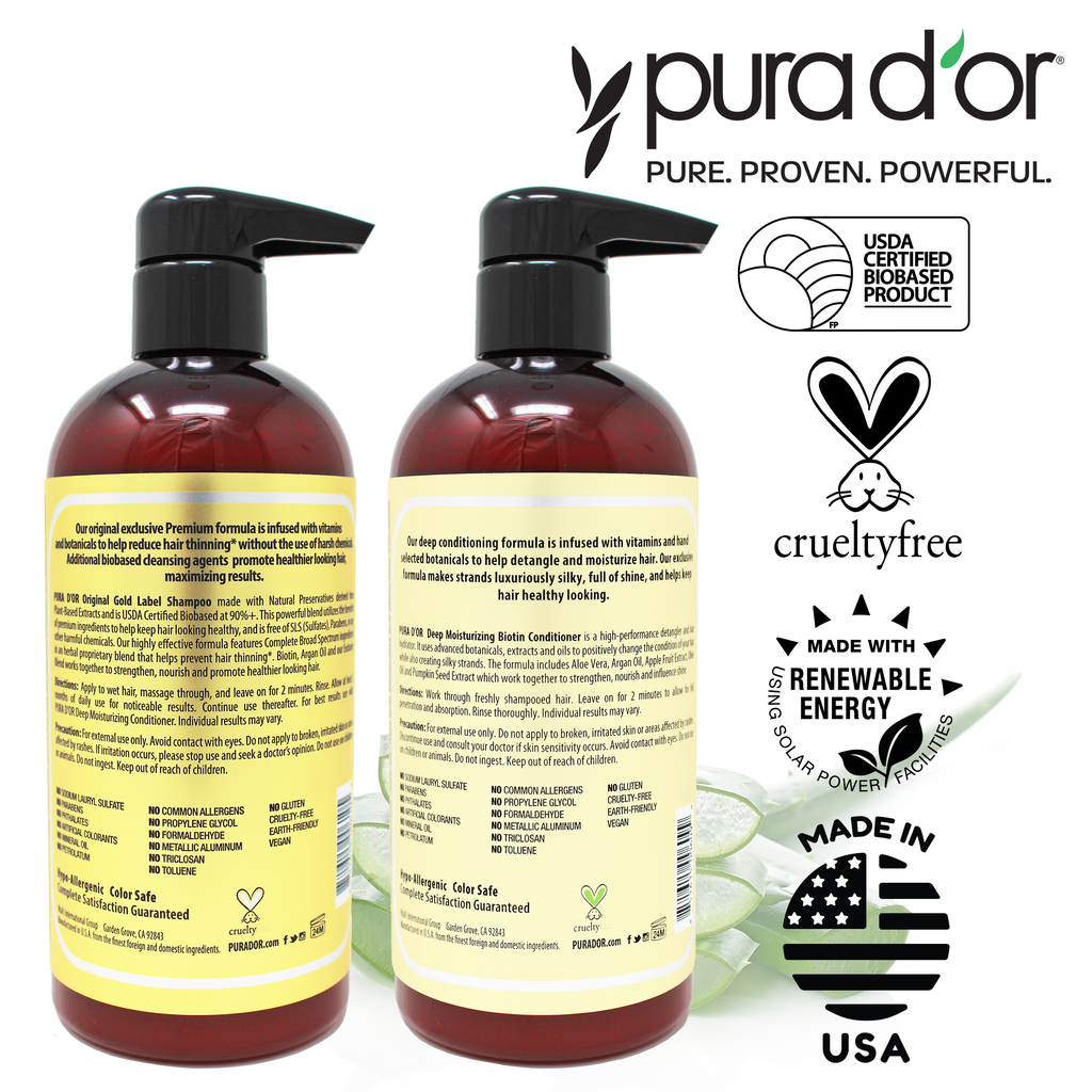 PURA D'OR Original Gold Label Shampoo and Deep Moisturizing Conditioner - Clinically tested formulas with effective results to help reduce hair thinning due to breakage, increase volume, strength and shine.* Our proprietary blend of 17 key active ingredients, organic extracts, and essential nutrients nourish hair to boost strength and resist breakage. Packed with a powerful blend of Biotin, Nettle, Pumpkin Seed, and Black Cumin Seed Oil to increase volume and thicken hair. Free from harsh chemicals, environmentally responsible, hypo-allergenic, vegan, and cruelty free.