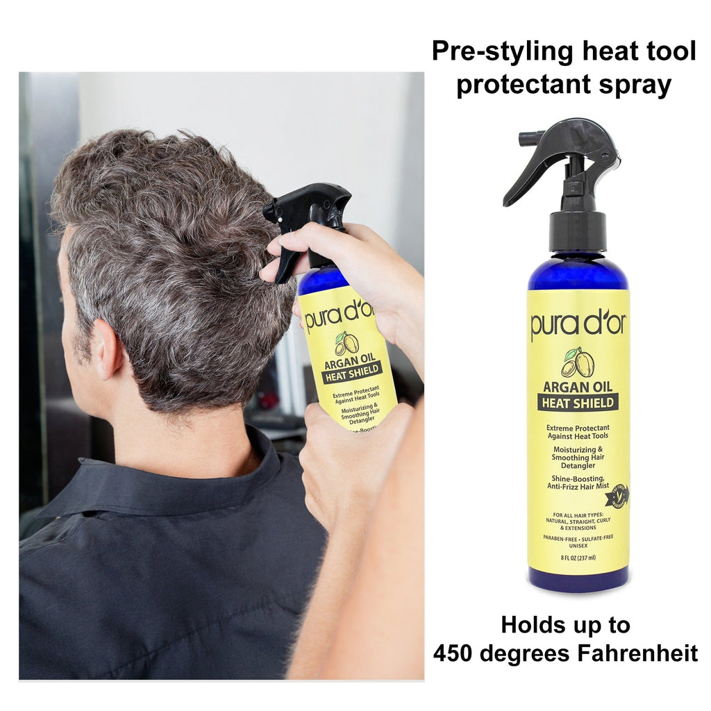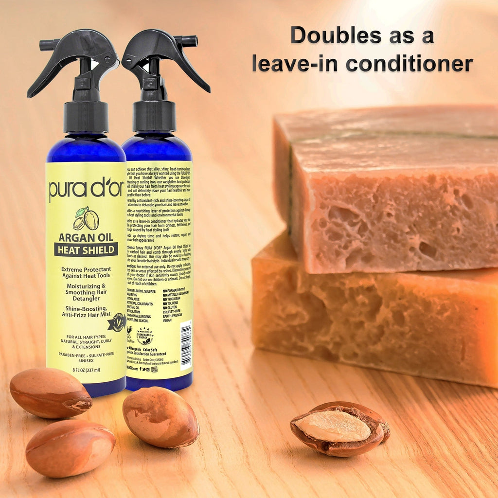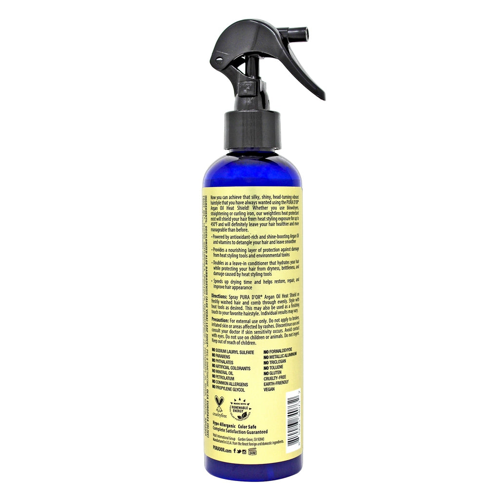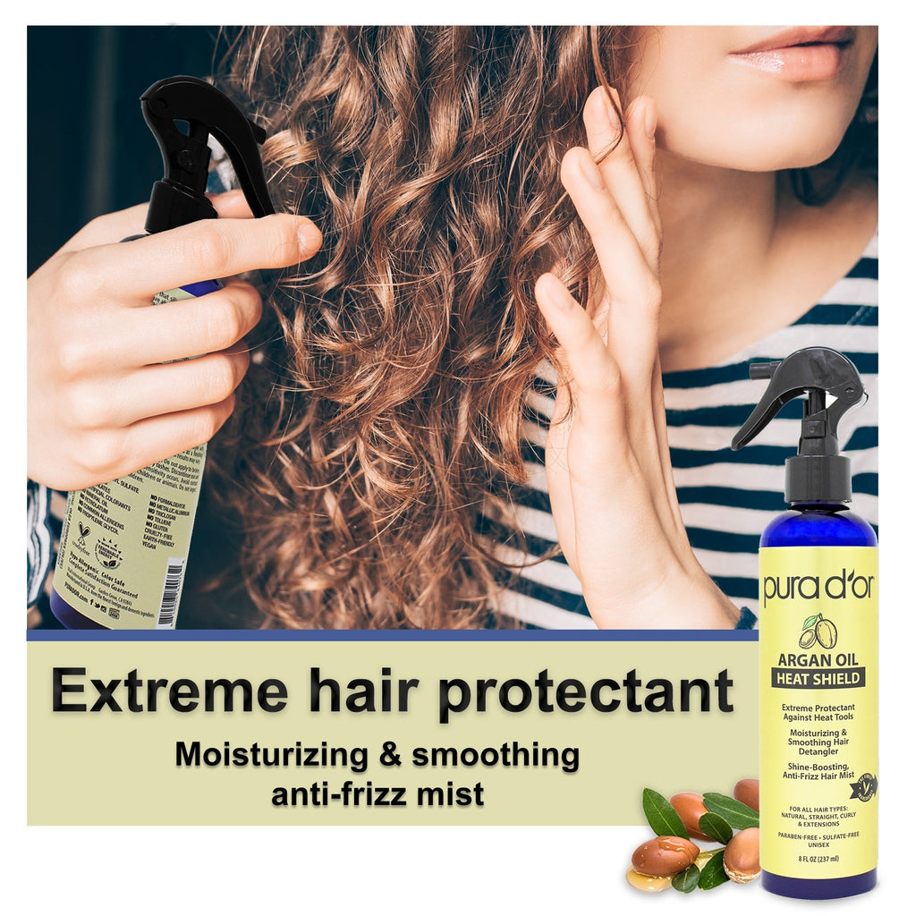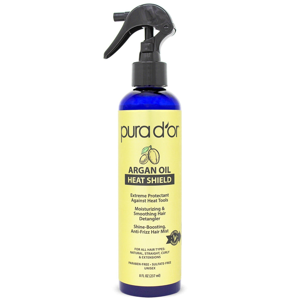Experience healthy, powerful, and rejuvenated hair health with PURA D'OR Argan Oil Heat Shield Protectant Spray. When you use heat tools like hair blower, straightening irons, curling irons, and others, your hair loses moisture and cause it to look dry, dull, and frizzy. Using our Argan Oil Heat Shield Protectant Spray provides extreme heat protection to your hair against the damage caused by heat styling tools so you never have to go through another bad hair day.