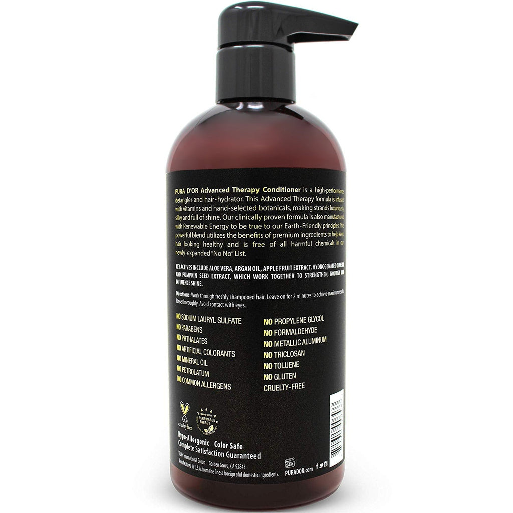Treat and Protect hair with PURA D’OR Advanced Therapy Conditioner! Clinically tested formula with effective results to help reduce hair thinning due to breakage, increase volume, strength and shine.* Our exclusive Aloe Vera base provides intense moisture and nourishment for healthy looking hair that feels great. Organic Argan Oil, Olive Oil, Pumpkin Seed Extract, and other premium ingredients enhance shine, promote manageability, and detangle hair. Free from harsh chemicals, environmentally responsible, hypo-allergenic, vegan, and cruelty free.