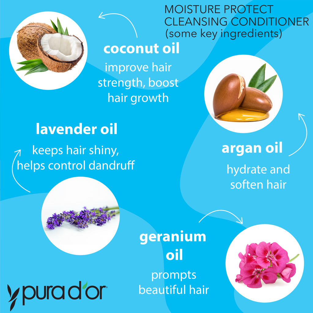 PURA D’OR Moisture Protect Cleansing Conditioner - Instant Refresh and Detangle. Gently cleanses and refreshes hair while detangling strands, locking in moisture and boosting shine. Our low-lather formula restores dry, damaged hair with Apple, Orange and Oat Bran, while Argan Oil and Coconut add luster and hydration. Free from harsh chemicals, environmentally responsible, hypo-allergenic, vegan and cruelty free.