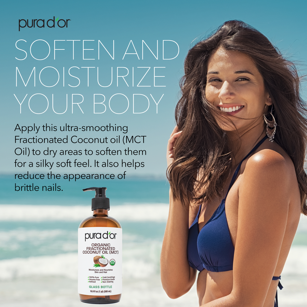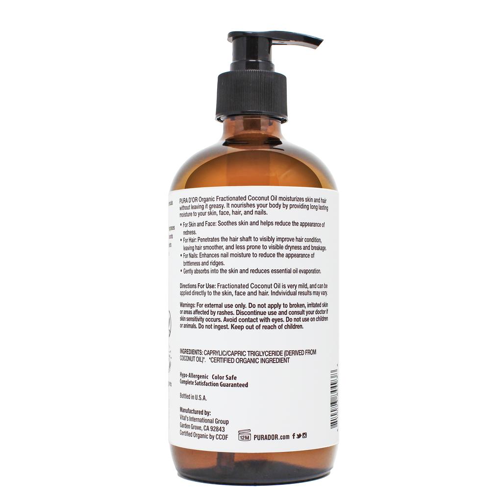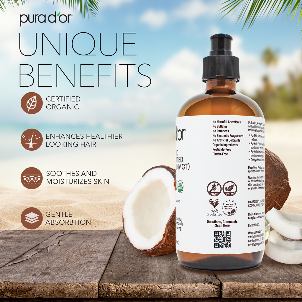 PURA D’OR brings one of nature's miracle beauty and personal care solutions to your doorstep—Fractionated Coconut Oil for hair. Compared to ordinary liquid coconut oil, Fractionated Coconut Oil for skin stays in its liquid form even at room temperature. It quick to absorb once it touches skin, making it an ideal carrier oil for essential oils. Fractionated Coconut Oil can be used as a moisturizer, makeup remover, and hair conditioner. It effectively nourishes dry skin and dull hair without leaving a greasy mess. This wonderful organic oil doesn't clog pores or leaves stains on clothing. PURA D’OR Fractionated Coconut Oil for essential oils is USDA Certified Organic and bottled domestically at our environmentally friendly facilities.