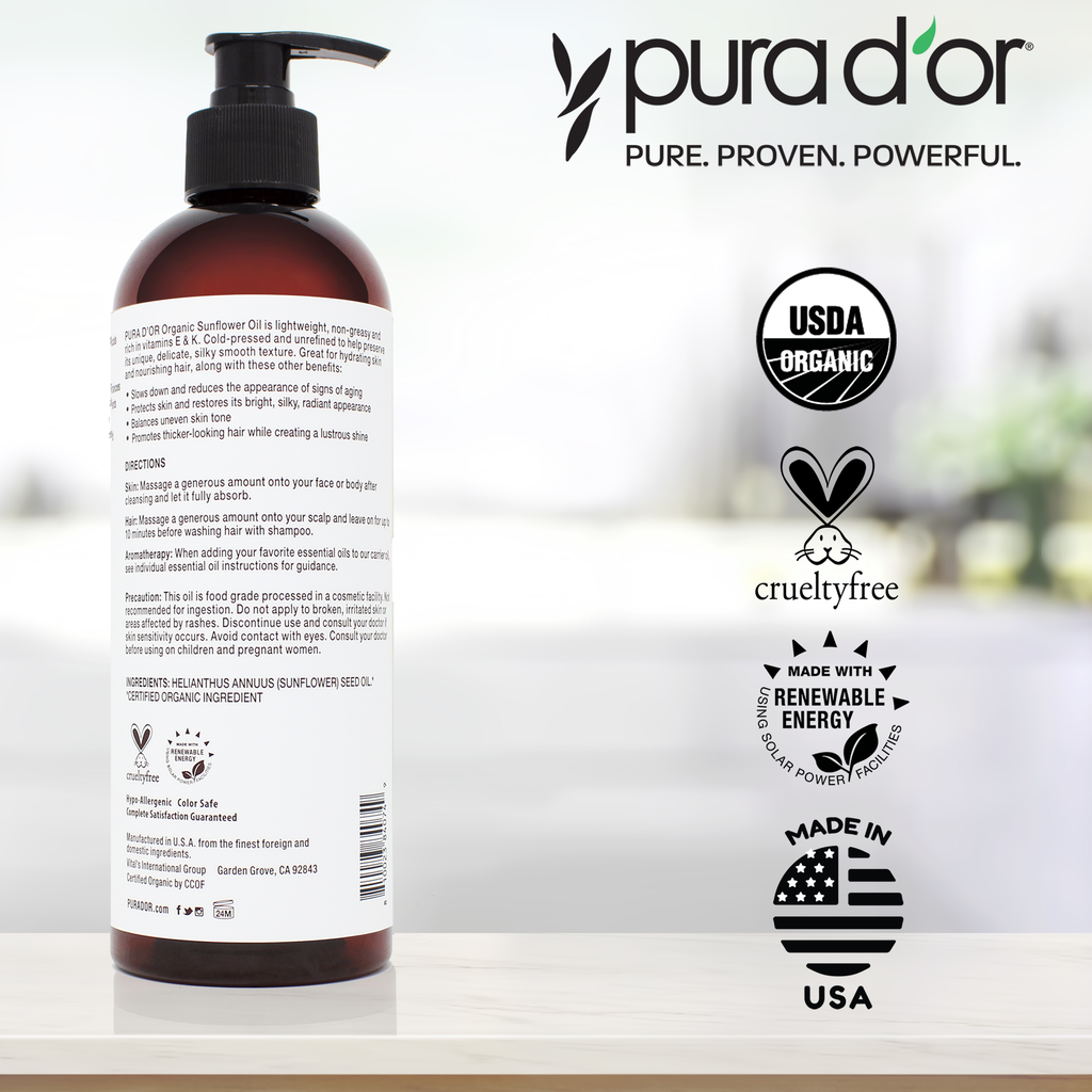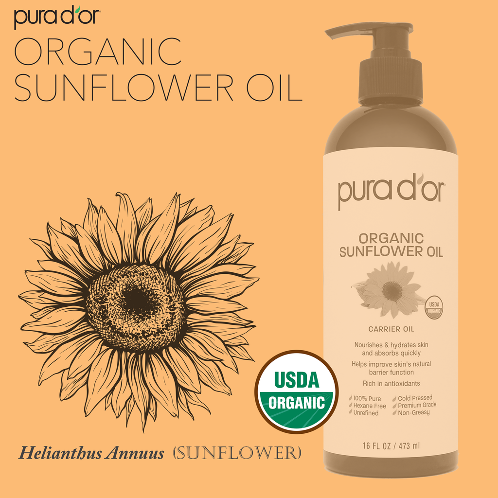 PURA D’OR Organic Sunflower Oil a new addition to your personal care routine. This lightweight, non-greasy multipurpose oil is cold-pressed, unrefined, and rich in nourishing vitamins and antioxidants.