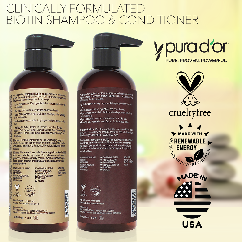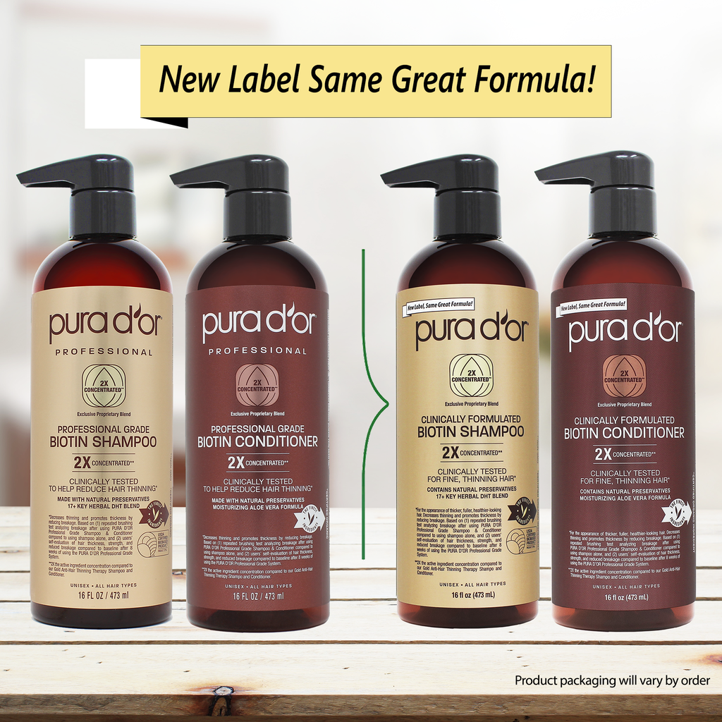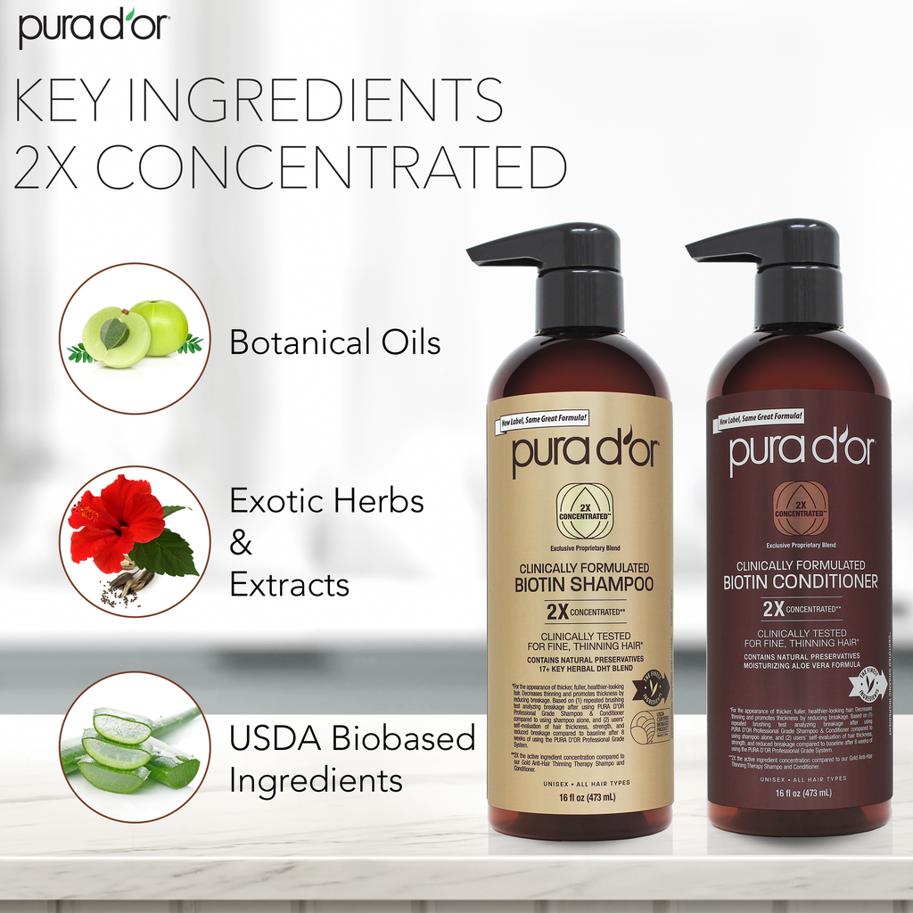 *For the appearance of thicker, fuller, healthier-looking hair. Decreases thinning and promotes thickness by reducing breakage. Based on (1) repeated brushing test analyzing breakage after using PURA D’OR Shampoo & Conditioner compared to using shampoo alone, and (2) users’ self-evaluation of hair thickness, strength, and reduced breakage compared to baseline after 8 weeks of using the PURA D’OR Shampoo & Conditioner System.