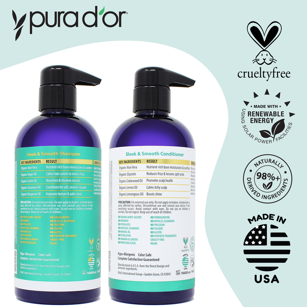 Apply shampoo to wet hair. Gently massage and work into a rich lather. Leave on hair for 2 minutes. Rinse thoroughly. Follow with PURA D’OR Sleek & Smooth Conditioner for best results. Leave on hair for two minutes. Rinse. Individual results may vary.